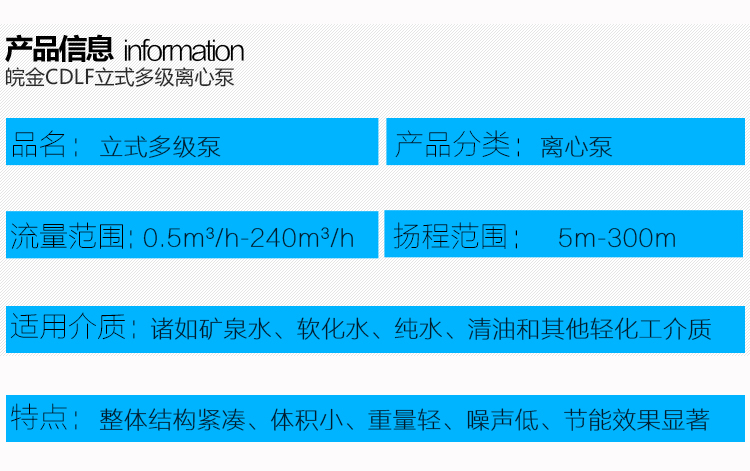 CDL/CDLF系列輕型不銹鋼立式多級離心泵是精心制造設計的非自吸立式多級離心泵,采用標準立式電機和快裝式機械密封,優化了機械密封結構,采用新穎的一套獨換式結構,可以輸送從自來水到工業液體的各種不同介質,適應于不同溫度、流量和壓力范圍,也適用于輕度腐蝕性液體更換方便。