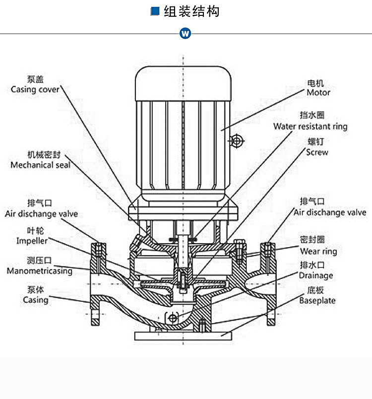 WJLG管道離心泵為立式結(jié)構(gòu),進(jìn)出口口徑相同,且位于同一中心線上,可象閥門一樣安裝在管路之中,外形緊湊美觀,占地面積小,建筑投入低,如加上防護(hù)罩則可置于戶外使用。葉輪直接