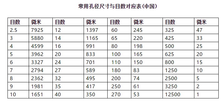 目數(shù),就是孔數(shù),就是每平方英寸上的孔數(shù)目。目數(shù)越大,孔徑越小。一般來說,目數(shù)×孔徑(微米數(shù))=15000。比如,400目的篩網(wǎng)的孔徑為38微米左右;500目的篩網(wǎng)的孔徑是30微米左右。