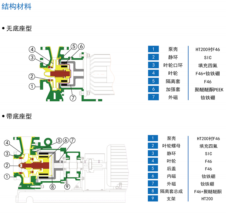 結構上:WJC-FJ磁力泵全系列均采用主軸不動,轉子與葉輪為一體式,全封閉無泄露設計,整泵采用后拉式拆裝結構,安裝拆卸非常方便。